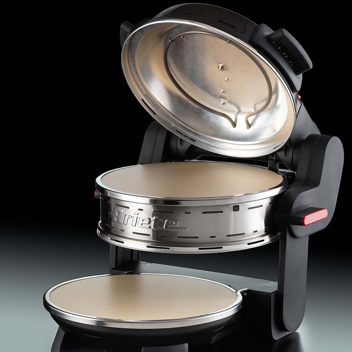 Em ambas as zonas de cocção, as pedras refratárias de 32 cm estão equipadas com um tratamento antiaderente transparente que facilita a limpeza da pedra, pois os resíduos e o óleo são removidos com mais facilidade. O forno para pizza permite assar ou aquecer pizzas e focaccias em 5 níveis de cocção até uma temperatura máxima de 400°C.