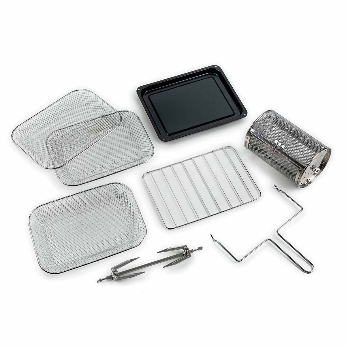 Acessórios: 3 cestos perfurados em aço inoxidável, cesto giratório em aço inoxidável, grelha em aço inoxidável, conjunto de espeto em aço inoxidável para assar e pingadeira