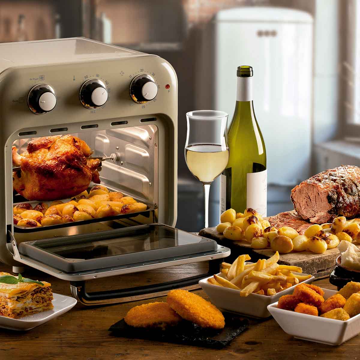 Com a Air Fryer e Forno Vintage você pode fritar qualquer prato que quiser em grandes quantidades usando apenas uma colher de sopa de óleo para obter pratos fritos saudáveis ​​e saborosos. Graças à sua capacidade de 16L, com a Air Fryer Vintage da Ariete você poderá cozinhar muitos alimentos fritos de uma só vez ! Batatas fritas, mas não só isso, também croquetes, peixes, carnes e tantos outros alimentos empanados, sejam congelados e prontos para fritar ou frescos e recém-empanados.