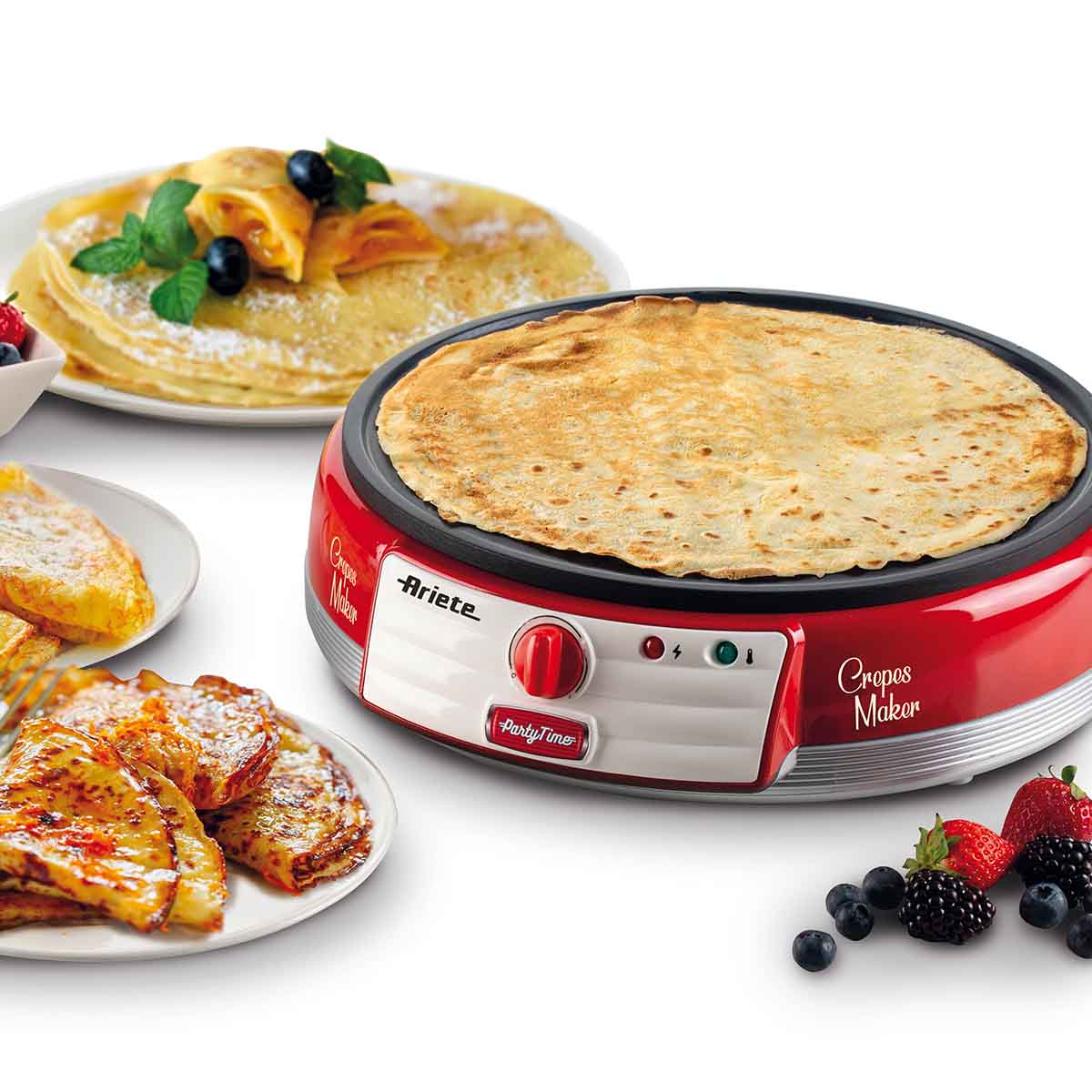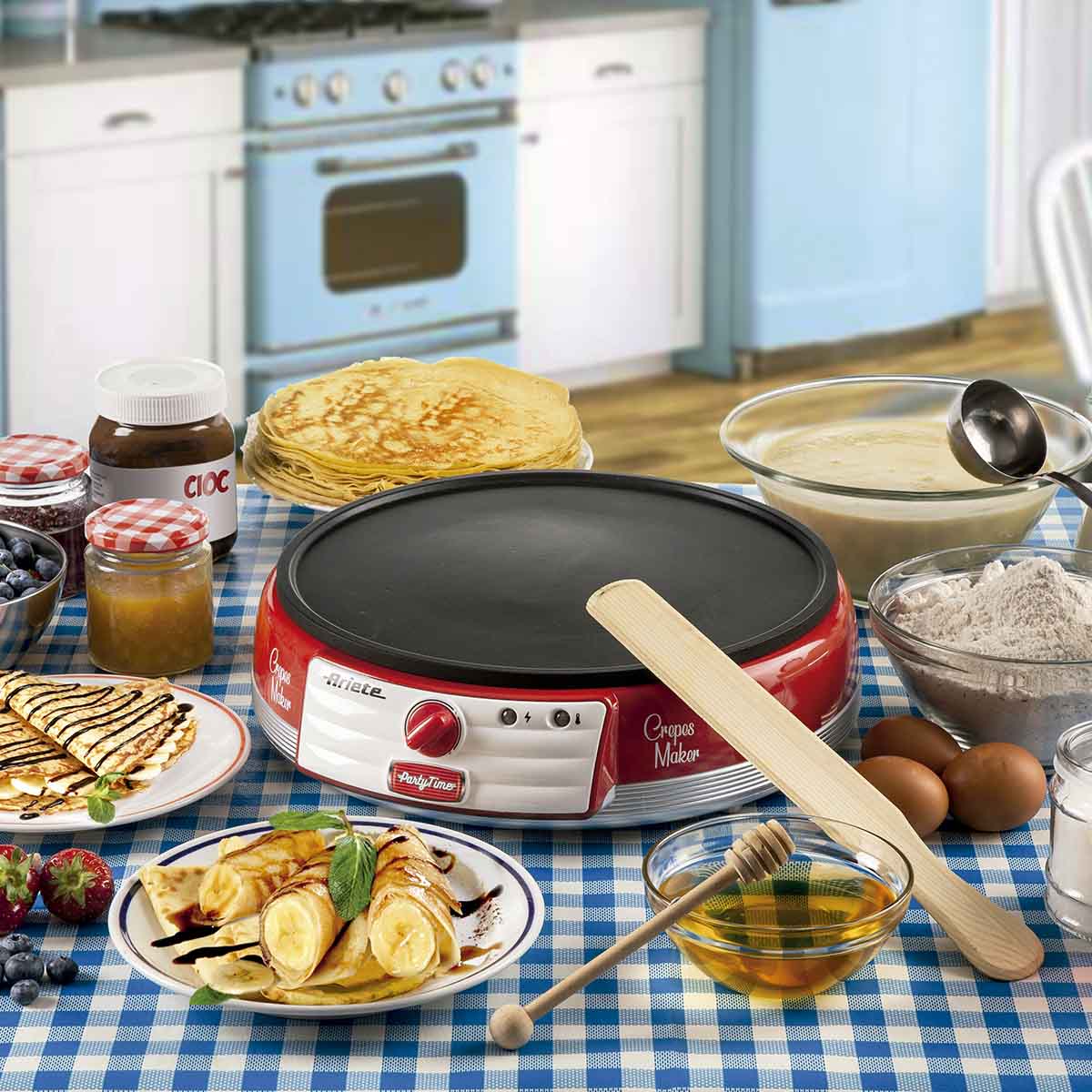 A linha Party Time se renova e transforma sua cozinha em um jantar americano dos anos 1950, com suas linhas inconfundíveis e diversos produtos pensados para  divertir toda a família e amigos. Leve a alegria dos crepes caseiros para a mesa com a nova Máquina de Crepes Party Time da Ariete: um crepe muito simples de fazer e que você não poderá mais viver sem! Deliciosos petiscos e festas em casa. Sua placa térmica é fabricada em material antiaderente, ideal para distribuir a massa e virar os crepes com facilidade, também graças às duas espátulas de madeira fornecidas. Com Máquina de Crepes Party Time você traz para a mesa crepes doces e salgados, mas também panquecas e wraps para serem recheados.
